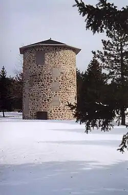 Hypothèse de restauration du Moulin à vent de la commune de Trois-Rivières, en 2003. Il avait une galerie circulaire et il n'avait pas de queue pour faire tourner le toit.