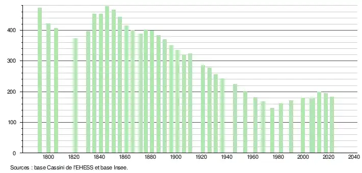 L'évolution du nombre d'habitants est connue à travers les recensements de la population effectués dans la commune depuis 1793. Pour les communes de moins de 10 000 habitants, une enquête de recensement portant sur toute la population est réalisée tous les cinq ans, les populations de référence des années intermédiaires étant quant à elles estimées par interpolation ou extrapolation[74]. Pour la commune, le premier recensement exhaustif entrant dans le cadre du nouveau dispositif a été réalisé en 2007[75].