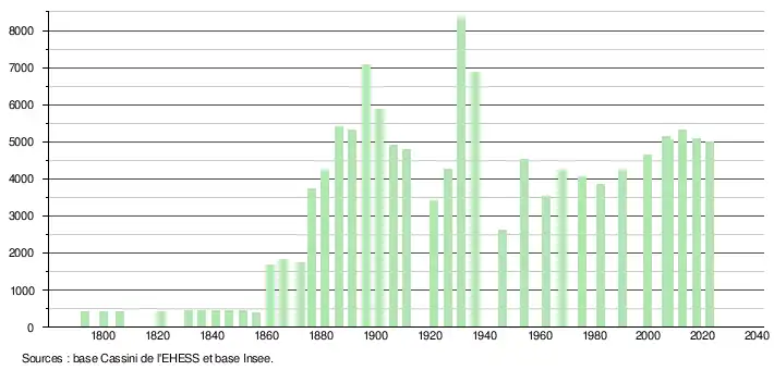 L'évolution du nombre d'habitants est connue à travers les recensements de la population effectués dans la commune depuis 1793. Pour les communes de moins de 10 000 habitants, une enquête de recensement portant sur toute la population est réalisée tous les cinq ans, les populations de référence des années intermédiaires étant quant à elles estimées par interpolation ou extrapolation[21]. Pour la commune, le premier recensement exhaustif entrant dans le cadre du nouveau dispositif a été réalisé en 2007[22].