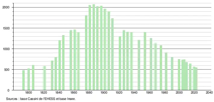 L'évolution du nombre d'habitants est connue à travers les recensements de la population effectués dans la commune depuis 1793. Pour les communes de moins de 10 000 habitants, une enquête de recensement portant sur toute la population est réalisée tous les cinq ans, les populations de référence des années intermédiaires étant quant à elles estimées par interpolation ou extrapolation[25]. Pour la commune, le premier recensement exhaustif entrant dans le cadre du nouveau dispositif a été réalisé en 2004[26].