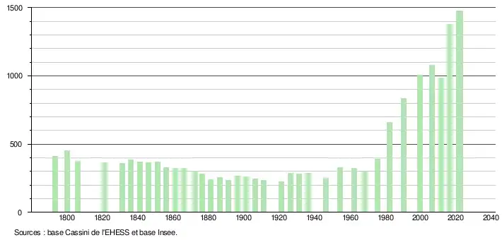 L'évolution du nombre d'habitants est connue à travers les recensements de la population effectués dans la commune depuis 1793. Pour les communes de moins de 10 000 habitants, une enquête de recensement portant sur toute la population est réalisée tous les cinq ans, les populations de référence des années intermédiaires étant quant à elles estimées par interpolation ou extrapolation[46]. Pour la commune, le premier recensement exhaustif entrant dans le cadre du nouveau dispositif a été réalisé en 2006[47].