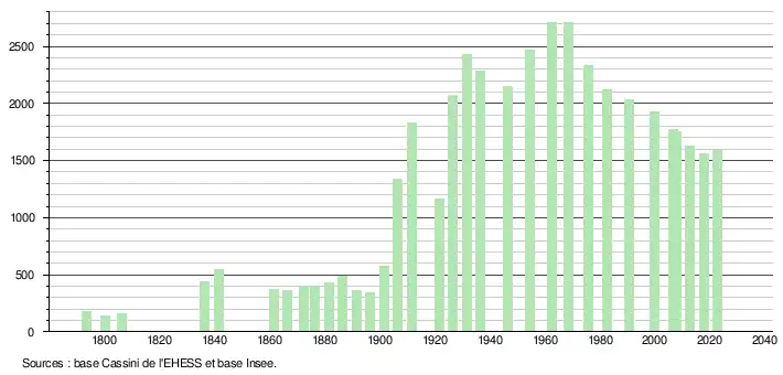 L'évolution du nombre d'habitants est connue à travers les recensements de la population effectués dans la commune depuis 1793. Pour les communes de moins de 10 000 habitants, une enquête de recensement portant sur toute la population est réalisée tous les cinq ans, les populations de référence des années intermédiaires étant quant à elles estimées par interpolation ou extrapolation[24]. Pour la commune, le premier recensement exhaustif entrant dans le cadre du nouveau dispositif a été réalisé en 2007[25].