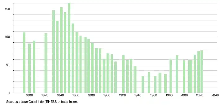 L'évolution du nombre d'habitants est connue à travers les recensements de la population effectués dans la commune depuis 1793. Pour les communes de moins de 10 000 habitants, une enquête de recensement portant sur toute la population est réalisée tous les cinq ans, les populations de référence des années intermédiaires étant quant à elles estimées par interpolation ou extrapolation[14]. Pour la commune, le premier recensement exhaustif entrant dans le cadre du nouveau dispositif a été réalisé en 2008[15].