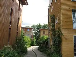 Vauban (Fribourg-en-Brisgau, Allemagne) est un écoquartier conforme à cette définition, le plus grand quartier sans voitures en Europe, avec plus de 5 000 habitants[41]. Si le quartier peut être considéré comme réellement sans voiture reste ouvert au débat: de nombreux habitants préfèrent le terme stellplatzfrei — littéralement « libre de places de stationnement » — pour décrire le système de gestion du trafic dans ce quartier. Les véhicules sont autorisés dans les rues résidentielles à la vitesse de la marche à pied, en particulier pour les livraisons, mais pas pour se garer, même s'il y a des infractions fréquentes. Les résidents des zones de stellplatzfrei doivent signer une déclaration annuelle indiquant s'ils possèdent une voiture ou non. Les propriétaires de voitures doivent acheter une place dans l'un des parkings à plusieurs étages sur la périphérie, géré par une société de conseil en propriété exclusive. Le coût de ces espaces — 17 500 euros en 2006, plus des frais mensuels — agit comme un frein à la possession d'une voiture[19].