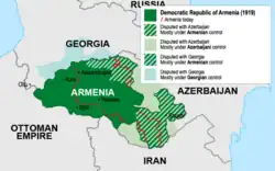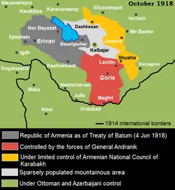 Pendant la Première Guerre mondiale, les Arméniens de l'Empire ottoman sont exterminés par le gouvernement durant le génocide arménien. Selon les estimations, sur la période allant de 1894 à 1923, entre 1 500 000 et 2 000 000 Arméniens sont tués[26]. Après que la décision de mettre en œuvre le génocide fut prise par le ministre de l'Intérieur ottoman Talaat Pacha et exécuté au départ par la Directive 8682 le , des dizaines de milliers d'Arméniens de Russie rejoignent l'armée russe du Caucase au sein des unités de volontaires arméniens avec la promesse du gouvernement russe qu'ils obtiendraient leur autonomie. Jusqu'en 1917, la Russie contrôle une bonne partie des régions de l'Empire ottoman où les Arméniens sont nombreux. Cependant, après la révolution d'Octobre, les troupes russes abandonnent le front du Caucase et laissent les troupes irrégulières arméniennes seules face à l'armée ottomane. Le Conseil national arménien proclame la république d'Arménie le , établissant ainsi un État arménien dans les provinces habitées par les Arméniens dans le Caucase du sud.
