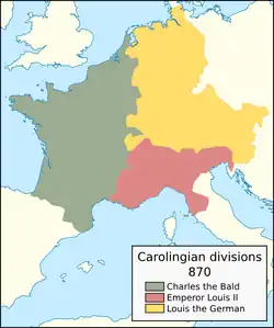 Juste avant de mourir, Charlemagne couronna empereur son unique fils Louis Ier (r. –) mais son règne fut marqué par les luttes de pouvoir entre ses fils. Avant sa mort, il divisa l'Empire entre son fils aîné Lothaire (d. 855) qui obtint la Francie orientale située à l'est du Rhin et son plus jeune fils, Charles (d. 877) qui reçut la Francie occidentale, tandis qu'un troisième fils, Louis (d. 876), fut autorisé à régner sur la Bavière sous la suzeraineté de Charles. Le partage fut contesté après la mort de Louis Ier et au terme d'une guerre civile de trois ans, les frères s'accordèrent sur le traité de Verdun[86]. Charles obtint les territoires occidentaux correspondant à une grande partie de la France actuelle, Louis reçut la Bavière et les territoires orientaux de l'Empire aujourd'hui situés en Allemagne tandis que Lothaire conserva son titre d'empereur et régna sur la Francie médiane située entre les possessions de ses deux frères[86]. Ces royaumes furent à leur tour divisés et toute cohésion interne disparut[87]. La dynastie carolingienne s'éteignit en Francie orientale en 911 avec la mort de Louis IV[88] et le choix de Conrad Ier sans lien de parenté[89]. Elle perdura plus longtemps en Francie occidentale mais fut finalement remplacée en 987 par la dynastie capétienne avec le couronnement de Hugues Capet (r. –).