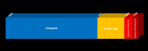 Le Moyen Âge est lui-même subdivisé en trois parties : le haut Moyen Âge de la fin du Ve siècle à la fin du Xe siècle, le Moyen Âge central ou classique du début du XIe siècle à la fin du XIIIe siècle et le bas Moyen Âge ou Moyen Âge tardif du début du XIVe siècle à la fin du XVe siècle[1].