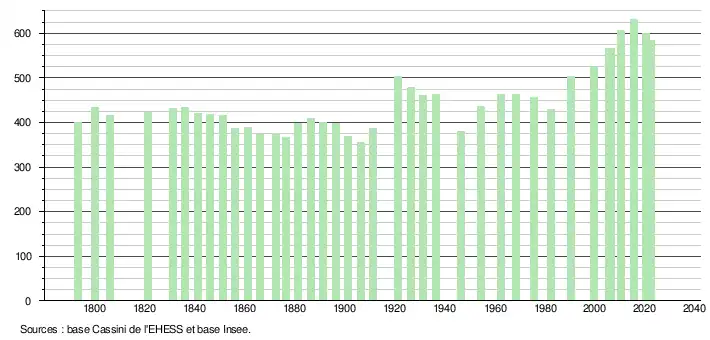 L'évolution du nombre d'habitants est connue à travers les recensements de la population effectués dans la commune depuis 1793. Pour les communes de moins de 10 000 habitants, une enquête de recensement portant sur toute la population est réalisée tous les cinq ans, les populations de référence des années intermédiaires étant quant à elles estimées par interpolation ou extrapolation[28]. Pour la commune, le premier recensement exhaustif entrant dans le cadre du nouveau dispositif a été réalisé en 2005[29].
