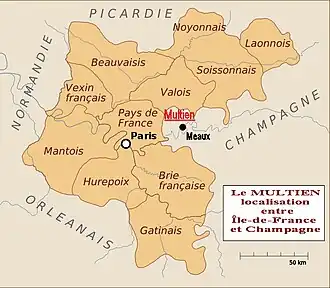 - ↑ Source sur l'étymologie de Multien : Michel Roblin, Petromanlalum, Saint-Clair et le Vexin, Journal des savants 1976, volume 1, numéro 1, p. 26. ; voir aussi Michel Toussaint Chrétien Du Plessis, Histoire De L'Eglise De Meaux, Avec Des Notes Ou Dissertations; Et Les Pieces Justificatives, Julien-Michel Gandouin, (lire en ligne), p. 610-611