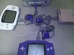 Un réseau de console : une GameCube en haut et trois Game Boy Advance dont un Game Boy Advance SP.