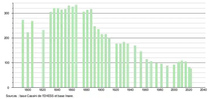 | L'évolution du nombre d'habitants est connue à travers les recensements de la population effectués dans la commune depuis 1793. Pour les communes de moins de 10 000 habitants, une enquête de recensement portant sur toute la population est réalisée tous les cinq ans, les populations de référence des années intermédiaires étant quant à elles estimées par interpolation ou extrapolation[22]. Pour la commune, le premier recensement exhaustif entrant dans le cadre du nouveau dispositif a été réalisé en 2005[23]. En 2022, la commune comptait 77 habitants[Note 3], en évolution de −24,51 % par rapport à 2016 (Hautes-Pyrénées : +1,59 %, France hors Mayotte : +2,11 %). |