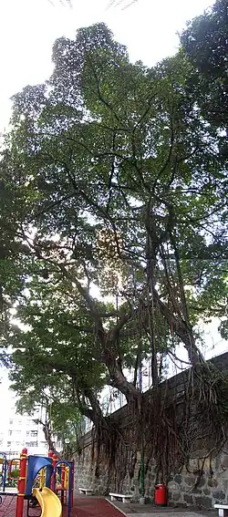 Il y a aussi un banian chinois poussant sur le mur à côté de l'hôpital de Lai Chi Kok (en), HACare Home.