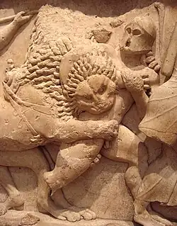 Métope du trésor des Athéniens, figurant le combat de Thésée contre Antiope, reine des Amazones. |