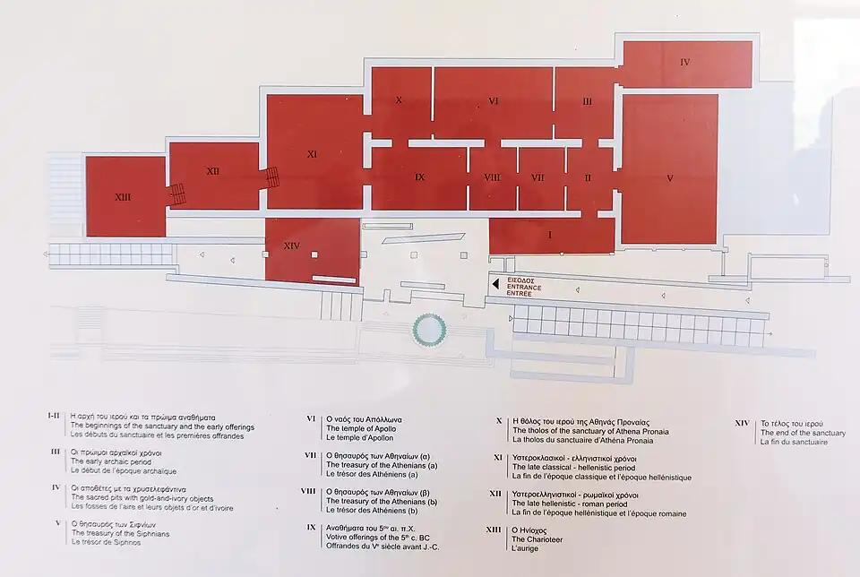 Organisé en quatorze salles sur deux étages, le musée expose principalement des statues, dont le célèbre « Aurige de Delphes », des éléments d'architecture comme la frise du trésor des Siphniens ou des offrandes faites au sanctuaire d'Apollon pythien comme le sphinx des Naxiens. En plus des salles d'exposition recouvrant 2 270 m2, des réserves et des salles de conservation (mosaïque, céramique et métaux) occupent 558 m2. Un hall d'accueil, une cafétéria et une boutique complètent les services offerts aux visiteurs[2].