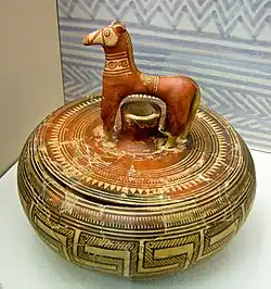 Pyxide décorée d'une poignée en forme de cheval, d'époque géométrique. |