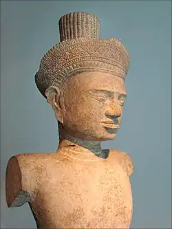 Statue de divinité masculine, en grès provient du Cambodge. Elle représente une divinité, comme le montre le diadème qui est un accessoire réservé aux dieux et aux déesses. Cette statue représente, sans doute, le dieu hindou Vishnu. Cette œuvre a été réalisée au début du XIIe siècle, sous le règne de Suryavarman II. Les yeux soulignés d’une incision se prolongeant vers les tempes, le chignon cylindrique ou encore le costume sont autant de marqueurs de ce « style d’Angkor Vat ».