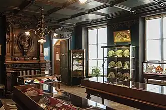 La salle d'exposition permanente est décorée dans le style Henri II, et comprend notamment une imposante cheminée, des meubles d'origine, des tapisseries bleues fleurdelisées, et un plafond à caisson[2],[1]. Les éventails qui y sont exposés vont du XVIIIe siècle à aujourd’hui[1]. Cette salle est classée aux Monuments Historiques depuis 2004.[réf. nécessaire]