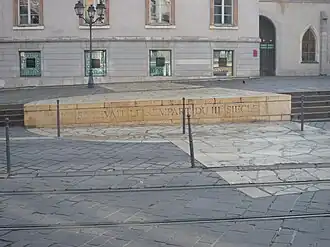 - ↑ Cette tour, dite « tour de l'évêché » s'est effondrée le 24 septembre 1802, fragilisée par la destruction de la « voûte romaine » commencée le 24 août, « pour donner plus de liberté à la circulation de l'air et au passage des voitures ». (cité par François Baucheron, Franck Gabayet, Alain de Montjoye 1998, p. 276).