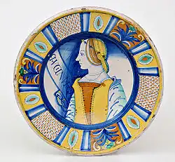 - Plat d'apparat avec représentation du roi Judas Maccabée à cheval, Deruta, première moitié du XVIe siècle[28].