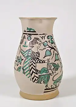 La récupération, à la fin du XIVe siècle, de thèmes légendaires tirés du classicisme est également intéressante : un décor d'Aristote monté par Phyllis sur une cruche de la fin du XIVe siècle en témoigne[7], qui rappelle l'allégorie, répandue du XIVe au XVIe siècle, de la suprématie des femmes sur les hommes[8].