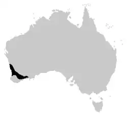 Cette espèce est endémique du Sud-Ouest de l'Australie-Occidentale. Elle se rencontre jusqu'à 600 m d'altitude[1],[2].