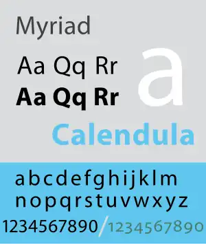 Myriad est une police de caractère sans serif créée par Robert Slimbach et Carol Twombly pour Adobe Systems. Cette police d'écriture est facilement identifiable par le jambage caractéristique de son y, la coupure oblique de son e ou, dans l'ensemble, par ses courbes arrondies.