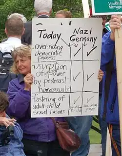 En 2015, les déclarations selon lesquelles les militants LGBT étaient des "voyous homofascistes bottés" et qu'Hitler était un homosexuel figuraient parmi les controverses qui ont conduit au limogeage du responsable du Comité national républicain, Bryan Fischer[36],[37]. Fischer a également affirmé que le parti nazi avait été fondé dans "un bar gay à Munich", que seuls les nazis qui étaient des "homosexuels purs et durs" pouvaient progresser dans les rangs du parti, et que "les militants homosexuels… [feront] la même chose pour vous que les nazis ont fait à leurs adversaires dans l'Allemagne nazie"[38]. Lors du référendum irlandais de 2015 sur le mariage homosexuel, le psychologue et avocat du No Gerard van den Aardweg "a affirmé que le parti nazi était" enraciné "dans les homosexuels"[39]. Dans Death of a Nation, un film de 2018 salué par Donald Trump, Jr., Dinesh D'Souza a affirmé qu'Hitler n'avait pas persécuté les homosexuels dans l'Allemagne nazie[40],[41].