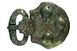 La plaque-boucle à 3 bossettes dans la tombe d'enfant présente un décor chargé très finement gravé, avec une croix de Saint-André et un motif zoomorphe de serpent. Cette plaque-boucle est conservée au musée Dobrée (numéro d'inventaire SRA 478).