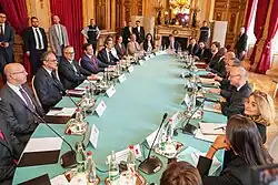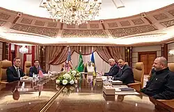 Le 18 février 2025, le secrétaire d'État américain Marco Rubio se rend à Riyad pour engager des pourparlers avec le ministre russe des Affaires étrangères Sergueï Lavrov. Il s'agit du premier dialogue diplomatique entre les États-Unis et la Russie depuis l'invasion de l'Ukraine par la Russie en 2022. La rencontre se conclut sur un accord pour établir un processus de paix aboutissant à la fin du conflit. La rencontre est critiquée par le président ukrainien Volodymyr Zelensky pour qui les conditions de la paix ne peuvent être ni négociées ni imposées à l'Ukraine sans sa participation à la table des négociations[24],[25],[26].