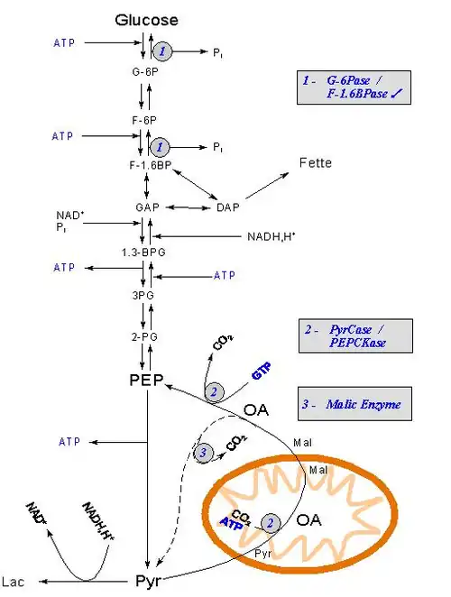 - L'oxaloacétate est finalement converti en phosphoénolpyruvate (PEP) par la phosphoénolpyruvate carboxykinase (PEPCK) en consommant un GTP et en libérant une molécule de CO2.