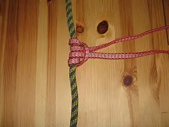 L'utilisation de sangles telles que celles de la photo est déconseillée, car une sangle supporte mal la friction et a un point de fusion plus faible qu'une corde. La tenue du nœud est meilleure avec une corde qu'avec une sangle[1].