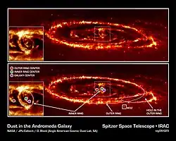 Des données acquises en 1998 dans l'infrarouge par le télescope spatial ISO de l'Agence spatiale européenne ont mis par ailleurs en évidence la présence d'anneaux concentriques, dont un, à environ 33 000 années-lumière (10 kpc) du centre galactique, concentre la majeure partie de la poussière et une grande partie du gaz de toute la galaxie[42]. Ces anneaux ne sont visibles qu'en infrarouge car ils sont constitués de poussières froides — à une température inférieure à 15 K — qui ne rayonnent pas aux longueurs d'onde visibles. L'existence de cet anneau pourrait indiquer que l'ensemble de la galaxie évolue vers une forme de galaxie à anneau.