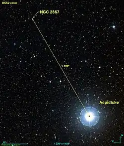 La nébuleuse NGC 2867 est située à environ 1,1 degrés au nord-est de Iota Carinae (Aspidiske), la 68e étoiles la plus brillante du ciel de la Terre.