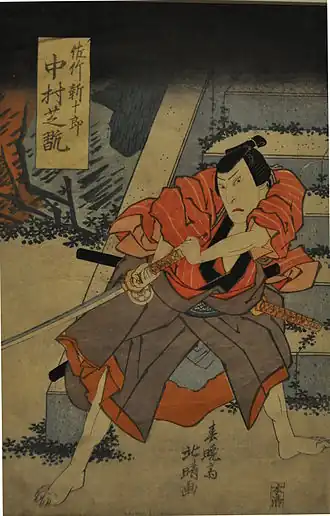 Littéralement « images kabuki », les kabuki-e commencent à être produites à Edo à la fin du XVIIe siècle[15]. Tandis que la popularité du théâtre kabuki s'accroît, des acteurs vedettes apparaissent ce qui amène la création des yakusha-e (役者絵), sous-genre des kabuki-e dans lequel les acteurs sont représentés individuellement - comme sur cette estampe - ou en paires[16],[17]. Ces images paraissent sur feuille uniques ou en livres de gravures d'acteurs appelés yakusha e-hon (役者絵本)[15].