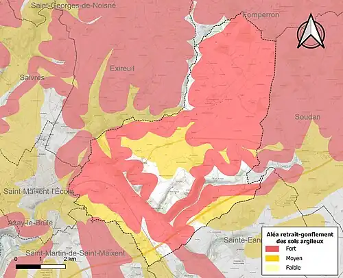 Les mouvements de terrains susceptibles de se produire sur la commune sont des tassements différentiels[19]. Le retrait-gonflement des sols argileux est susceptible d'engendrer des dommages importants aux bâtiments en cas d’alternance de périodes de sécheresse et de pluie[20]. 88,2 % de la superficie communale est en aléa moyen ou fort (54,9 % au niveau départemental et 48,5 % au niveau national)[Carte 2]. Depuis le , en application de la loi ELAN, différentes contraintes s'imposent aux vendeurs, maîtres d'ouvrages ou constructeurs de biens situés dans une zone classée en aléa moyen ou fort[Note 4],[21].