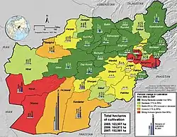 Autre point de comparaison issu de l'ONUDC, d'après ses rapports opium survey 2001[29] et Afghanistan Opium Survey 2007[30], la surface cultivée en pavot est passée de 7 606 ha en 2001 (dont plus de 80 %, 6 342 ha, dans la province du Badakhshan, celle qui était à l'époque principalement contrôlée par l'Alliance du Nord), à 197 000 ha en 2007 (dont 70 % dans cinq provinces du Sud-Ouest bordant le Pakistan, principalement celle de Helmand). Ceci représente une multiplication par 26 de la surface cultivée entre la dernière année du régime des talibans et 2006.