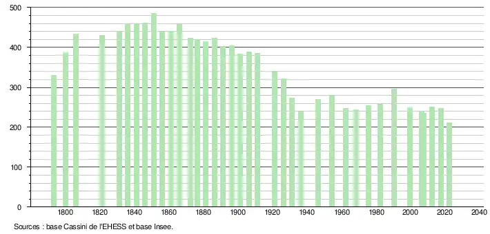 L'évolution du nombre d'habitants est connue à travers les recensements de la population effectués dans la commune depuis 1793. Pour les communes de moins de 10 000 habitants, une enquête de recensement portant sur toute la population est réalisée tous les cinq ans, les populations de référence des années intermédiaires étant quant à elles estimées par interpolation ou extrapolation[15]. Pour la commune, le premier recensement exhaustif entrant dans le cadre du nouveau dispositif a été réalisé en 2007[16].