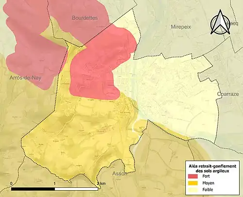 Le territoire de la commune de Nay est vulnérable à différents aléas naturels : météorologiques (tempête, orage, neige, grand froid, canicule ou sécheresse), inondations, mouvements de terrains et séisme (sismicité moyenne)[25]. Un site publié par le BRGM permet d'évaluer simplement et rapidement les risques d'un bien localisé soit par son adresse soit par le numéro de sa parcelle[26].