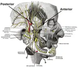 Le nerf buccal est une branche du nerf mandibulaire (V3), lui-même issu du nerf trijumeau (V).