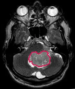 L'IRM montre généralement une lésion de contraste massive impliquant le cervelet. Comme mentionné ci-dessus, le médulloblastome a une forte propension à infiltrer localement les leptoméninges ainsi qu'à se propager à travers l'espace sous-arachnoïdien, impliquant les ventricules, la convexité cérébrale et les surfaces leptoméningées de la colonne vertébrale. Par conséquent, il est nécessaire de mettre en résonance tout l'axe crânio-spinal.