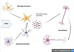 Au cours de la réponse inflammatoire induite par une lésion médullaire, plusieurs cytokines proinflammatoires, dont l'interleukine 1β (IL-1β), l'oxyde nitrique synthase inductible (iNOS), l'interféron γ (IFN-γ), l'IL-6, l'IL-23 et le facteur de nécrose tumorale α (TNFα), sont sécrétées, activant la microglie locale et attirant diverses cellules immunitaires, telles que les macrophages naïfs dérivés de la moelle osseuse.[17] Ces microglies et macrophages activés jouent un rôle dans la pathogenèse de la lésion médullaire.
