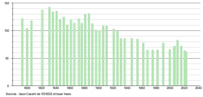 L'évolution du nombre d'habitants est connue à travers les recensements de la population effectués dans la commune depuis 1793. Pour les communes de moins de 10 000 habitants, une enquête de recensement portant sur toute la population est réalisée tous les cinq ans, les populations de référence des années intermédiaires étant quant à elles estimées par interpolation ou extrapolation[34]. Pour la commune, le premier recensement exhaustif entrant dans le cadre du nouveau dispositif a été réalisé en 2005[35].