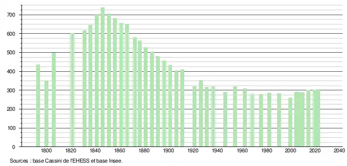 L'évolution du nombre d'habitants est connue à travers les recensements de la population effectués dans la commune depuis 1793. Pour les communes de moins de 10 000 habitants, une enquête de recensement portant sur toute la population est réalisée tous les cinq ans, les populations de référence des années intermédiaires étant quant à elles estimées par interpolation ou extrapolation[18]. Pour la commune, le premier recensement exhaustif entrant dans le cadre du nouveau dispositif a été réalisé en 2004[19].