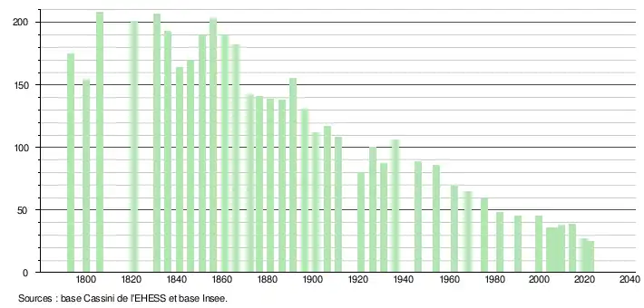 L'évolution du nombre d'habitants est connue à travers les recensements de la population effectués dans la commune depuis 1793. Pour les communes de moins de 10 000 habitants, une enquête de recensement portant sur toute la population est réalisée tous les cinq ans, les populations de référence des années intermédiaires étant quant à elles estimées par interpolation ou extrapolation[25]. Pour la commune, le premier recensement exhaustif entrant dans le cadre du nouveau dispositif a été réalisé en 2004[26].