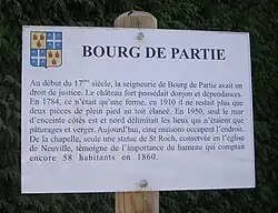 En 1784, le château de Bourg de Partie n'était plus qu'une ferme, dont il ne restait en 1910 que deux pièces de plain pied au toit élancé. En 1950, seul le mur d'enceinte côtés Est et Nord, délimitait les lieux qui n'étaient que pâturages et verger. Aujourd'hui cinq maisons occupent l'endroit. De la chapelle, seule une statue de saint Roch, conservée en l'église de Neuville, témoigne de l'importance du hameau qui comptait encore 58 habitants en 1860.