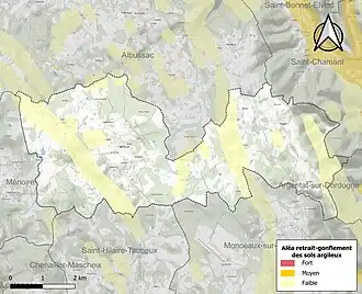 Le retrait-gonflement des sols argileux est susceptible d'engendrer des dommages importants aux bâtiments en cas d’alternance de périodes de sécheresse et de pluie. Aucune partie du territoire de la commune n'est en aléa moyen ou fort (26,8 % au niveau départemental et 48,5 % au niveau national). Sur les 147 bâtiments dénombrés sur la commune en 2019, aucun n'est en aléa moyen ou fort, à comparer aux 36 % au niveau départemental et 54 % au niveau national. Une cartographie de l'exposition du territoire national au retrait gonflement des sols argileux est disponible sur le site du BRGM[15],[Carte 2].