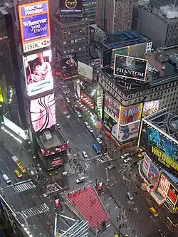 New York accueille quelque 50 millions de visiteurs annuellement[12],[13],[14]. Times Square, « The Crossroads of the World (« Le carrefour du monde ») »[15],[16],[17], est l'une des intersections les plus populaires du monde[18], et le quartier des théâtres de Broadway[19] est la plaque tournante du spectacle dans le pays tout entier et un centre majeur de l'industrie du divertissement dans le monde[20]. La ville abrite un grand nombre de ponts et tunnels (789 en 2012[21]), gratte-ciel et parcs de renommée mondiale[22].