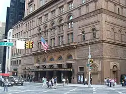 C'est également au XIXe siècle que New York se positionna comme premier centre des affaires du pays : la vocation financière de la métropole se développa avec la création de la Bank of New York en 1784 et l'ouverture de la bourse en 1792. Plus tard, des bourses spécialisées furent fondées (bourse aux grains en 1850, au coton en 1868)[121]. L'indice boursier du Dow Jones fut créé en 1896[102]. Les grandes enseignes telles que Macy's et Bloomingdale's virent le jour dans la deuxième moitié du XIXe siècle. Broadway devint l'artère commerçante de la ville.