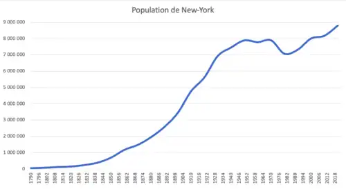 À partir des années 1790, la ville de New York connut une importante croissance démographique et devint la plus peuplée des États-Unis en 1820[102]. New York comptait 124 000 habitants contre 62 000 pour Philadelphie et environ 41 500 pour Boston[103]. En 1811, le Commissioners' Plan imposa le plan hippodamien pour le développement de la ville. Les premiers quartiers ethniques de New York sont créés après la Guerre anglo-américaine de 1812[104].