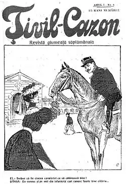 La plupart des dessins de Ţivil-Cazon ont été réalisés par Nicolae Petrescu-Găină et repris dans Zeflemeaua : il s’agit encore de caricatures s’inspirant de la vie quotidienne des soldats et des officiers pendant leurs loisirs ou à la caserne, ou de portraits et de caricatures de personnalités politiques et militaires, comme Jacob Lahovari, John Culcer, Gheorghe Manu ou le commandant Emanoil Koslinski[44].